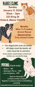 Dog Licenses are due at the end of January. For any dogs needing to update their rabies vaccine or any other vaccine there is a clinic in Oxford on Jan 11, 2026 from 10am-2pm. See flyer.